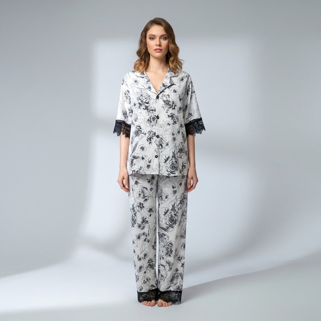 Unwind in style with our Floral Lace-Trimmed Pajama Set, a perfect blend of classic tailoring and feminine detail. This two-piece set features a sophisticated all-over botanical print in a timeless black-on-cream palette. The button-down top is designed with a traditional notched collar and relaxed short sleeves, elevated by wide panels of delicate black eyelash lace at the cuffs.