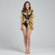 Triangle Top & Strappy Bodice: The bra top features a triangle design with multi-strap detailing that frames the body.