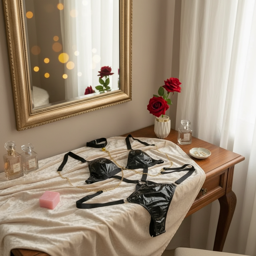 Embrace your bold side with this High-Shine Black Lingerie Set, designed for an edgy and adventurous look. This set utilizes a glossy latex-style fabric that shimmers in the light, creating a modern and provocative silhouette. The highlight of this ensemble is the included choker and gold-tone chain that extends to the waist, making the set even more daring.