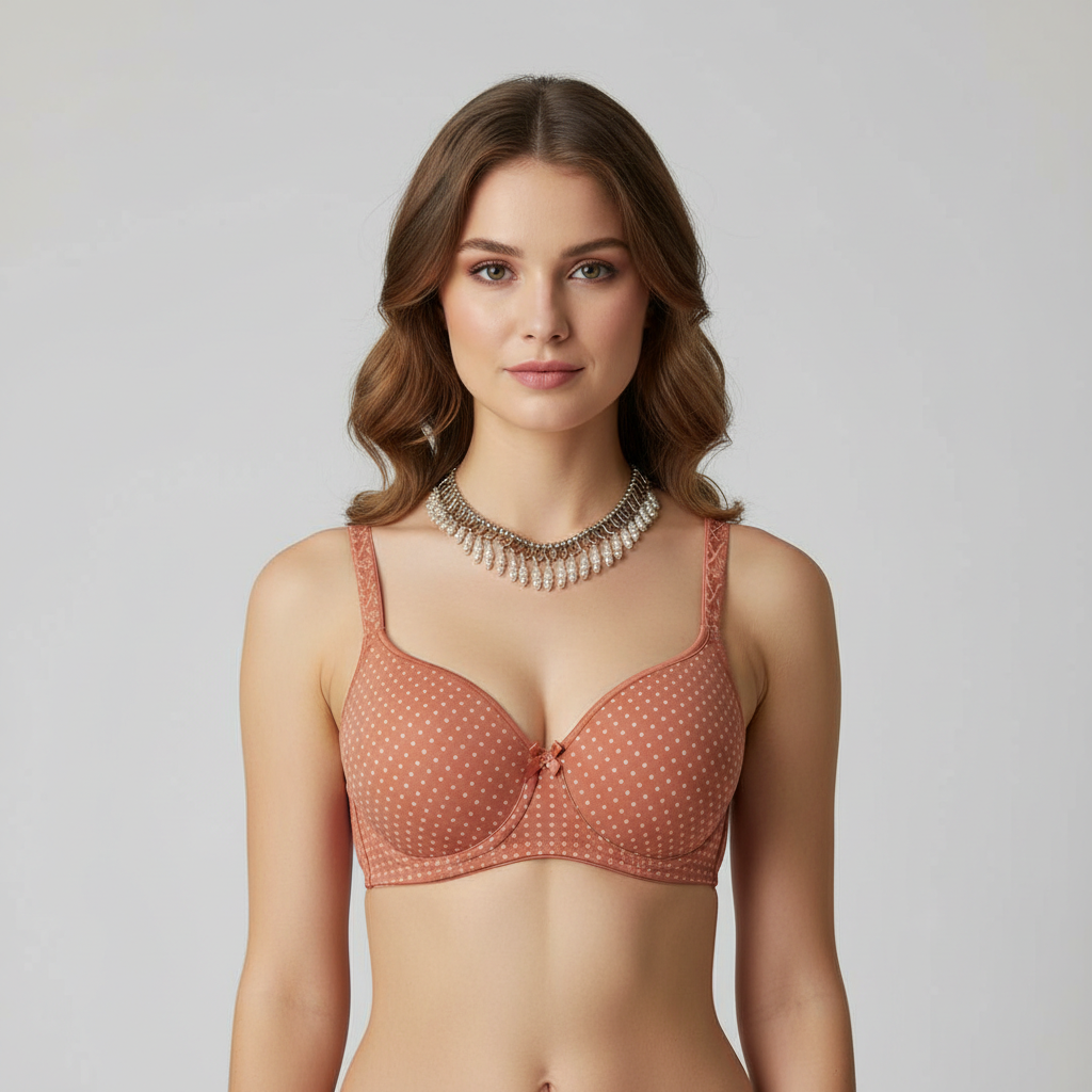 Add a touch of vintage charm to your top drawer with our Polka Dot Print Bra. This essential piece combines a playful, timeless pattern with modern construction for all-day support. The smooth, molded cups are designed with a classic polka dot print that offers a seamless look under your favorite outfits. Finished with delicate lace trim on the straps and a charming satin bow, this bra is the perfect blend of cute aesthetic and practical function.