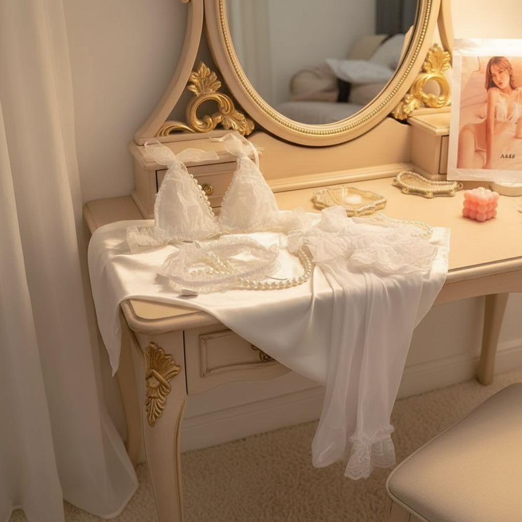 Embrace sophisticated allure with our Pearl-Accented Satin Lingerie Set. This exquisite two-piece features delicate tulle ruffles along the bra cups and waistline, creating a soft, romantic silhouette. The standout feature is the faux-pearl draping on both the bra and the panty, adding a touch of vintage luxury. Crafted from high-quality satin, this set is designed for those who appreciate fine details and a graceful fit.