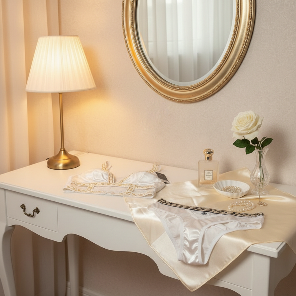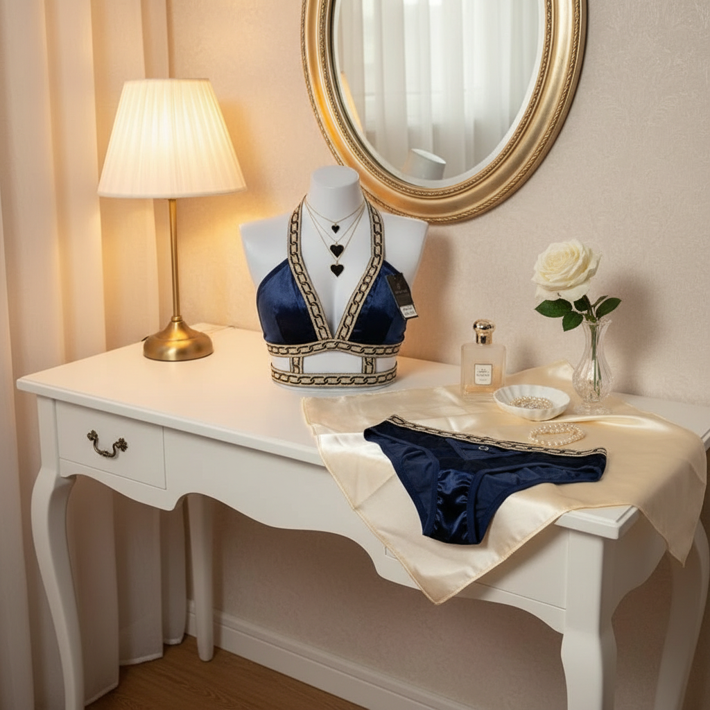 Crafted from high-lustre satin, the set includes a matching low-rise panty with coordinating chain-trim borders and a chic cutout detail at the front. Whether you are looking for a bold evening look or a premium gift, this set delivers a polished and powerful aesthetic.