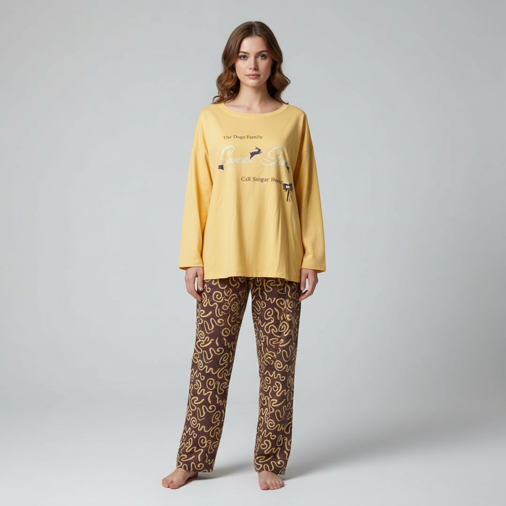 Relax in style with our "Sweet Girl" Pajama Set, the ultimate choice for cozy nights and lazy mornings. This two-piece ensemble features a relaxed-fit, long-sleeve top with a charming "Sweet Girl" graphic and a whimsical "Dogs Family" illustration. Paired with coordinating full-length lounge pants in a modern, abstract swirl print, this set offers a playful yet sophisticated look for your sleepwear collection.